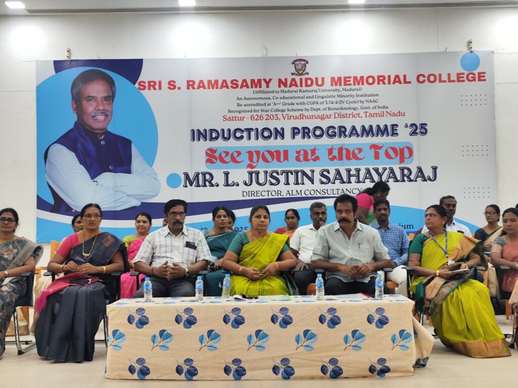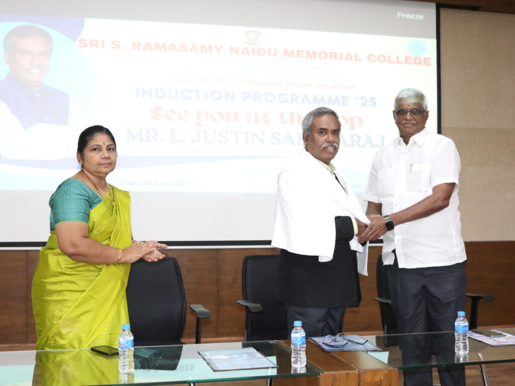 Sri S. Ramasamy Naidu Memorial College, Sattur, organised the Student Induction Programme ‘25 on 18th June 2025 to welcome the newly admitted first-year students of the academic year 2025–2026. The programme was aimed at familiarising the students with the institutional ethos, academic framework, support systems, and campus facilities while inspiring them to embark on their higher education journey with confidence and purpose.