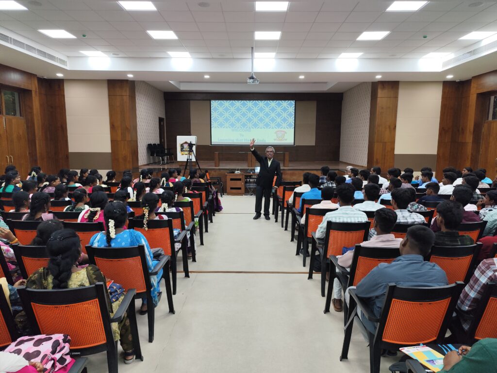 The afternoon session, titled “See You at the Top”, was designed to provide students with motivational insights for academic and personal growth. The session commenced with a welcome address by Lt. Dr. B. Ajantha, setting the tone for the inspirational talks. Mr. E. Perumalsamy, Director of the institution, delivered the Presidential Address, encouraging students to pursue knowledge with sincerity and determination. Dr. K. Krishnaveni, in her felicitation, motivated the students to take full advantage of the opportunities provided by the college.