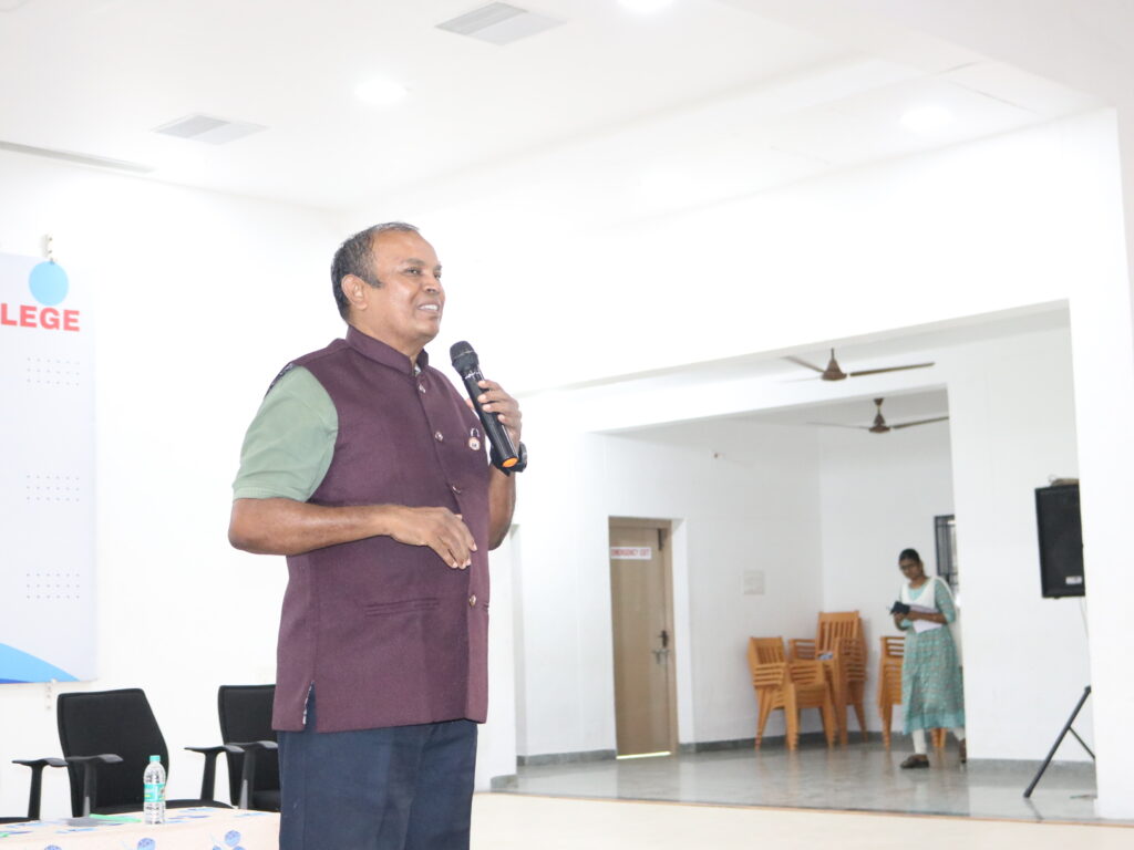 This was followed by the introduction of the Chief Guest by Dr. S. Nithya, NSS Programme Officer, who detailed the notable contributions of Mr. S. Nagalingam, IRS (Retd.), Founder and Head Coach of the Nikhil Foundation. With a distinguished background in public service and youth training, Mr. Nagalingam was welcomed as the ideal speaker for a session centred on emotional insight and social responsibility.